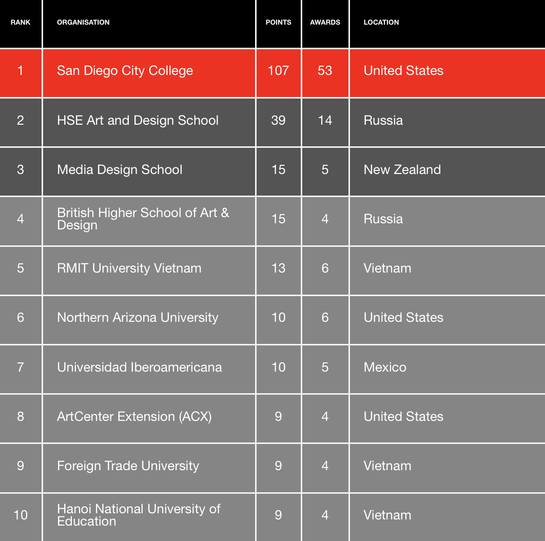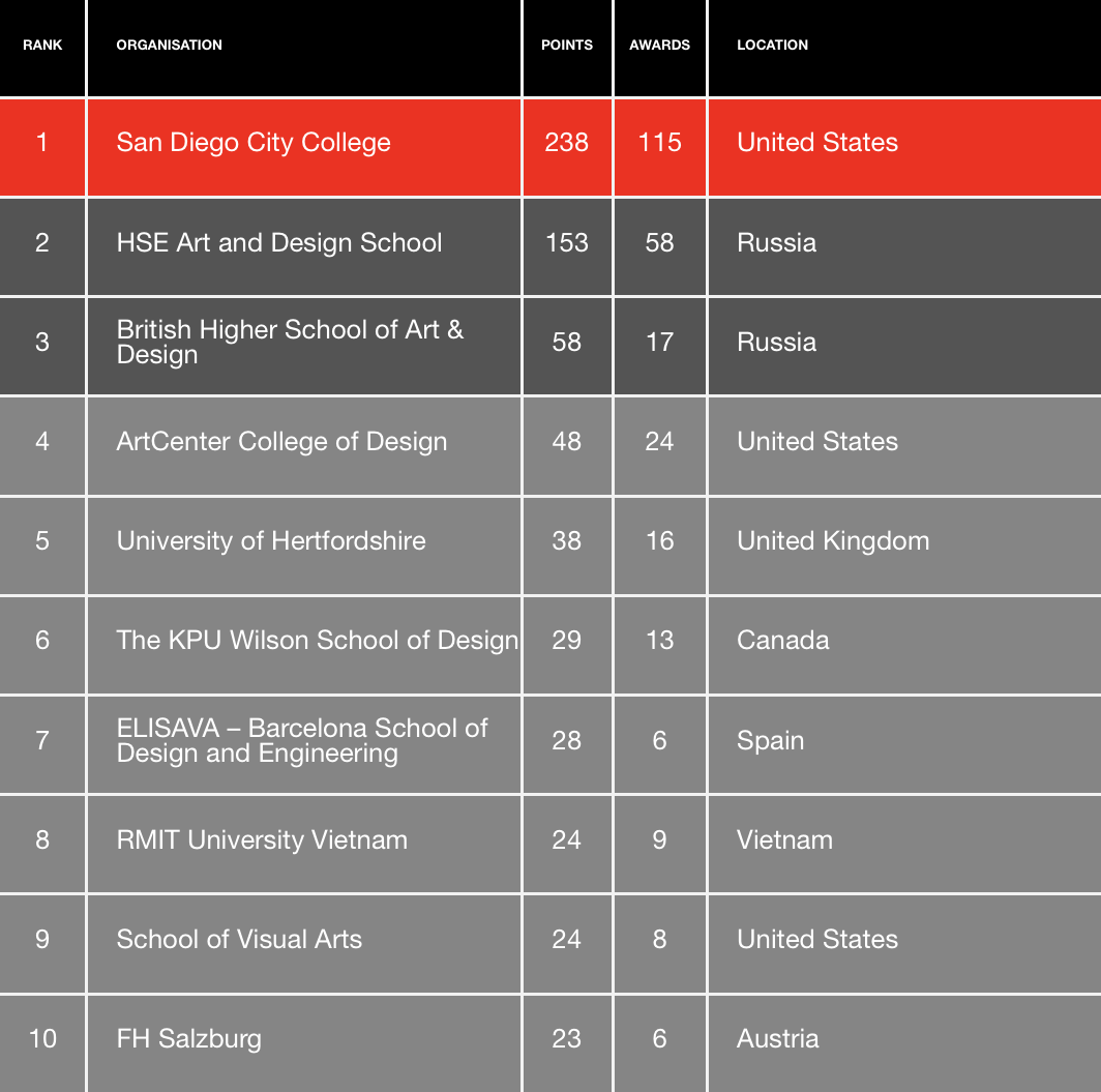 WBDS Best Design Education Ranking of 2023/24 in 2018. As from the 2024/2025 season all points have been revised based on the following formula values: 1st = 5 points, 2nd = 4 points, 3rd = 3 points, Black = 5 points, Gold = 4 points, Silver = 3 points, Bronze 2 = Points, Commended = 1 Point. These points values are now added to all Best Design Education Ranking of 2023/24 and Global Design Education Ranking. Full Ranking can be found here.